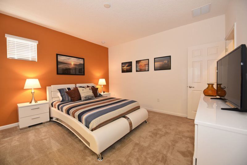 Enjoy the king-sized bed in this sunset themed bedroom.